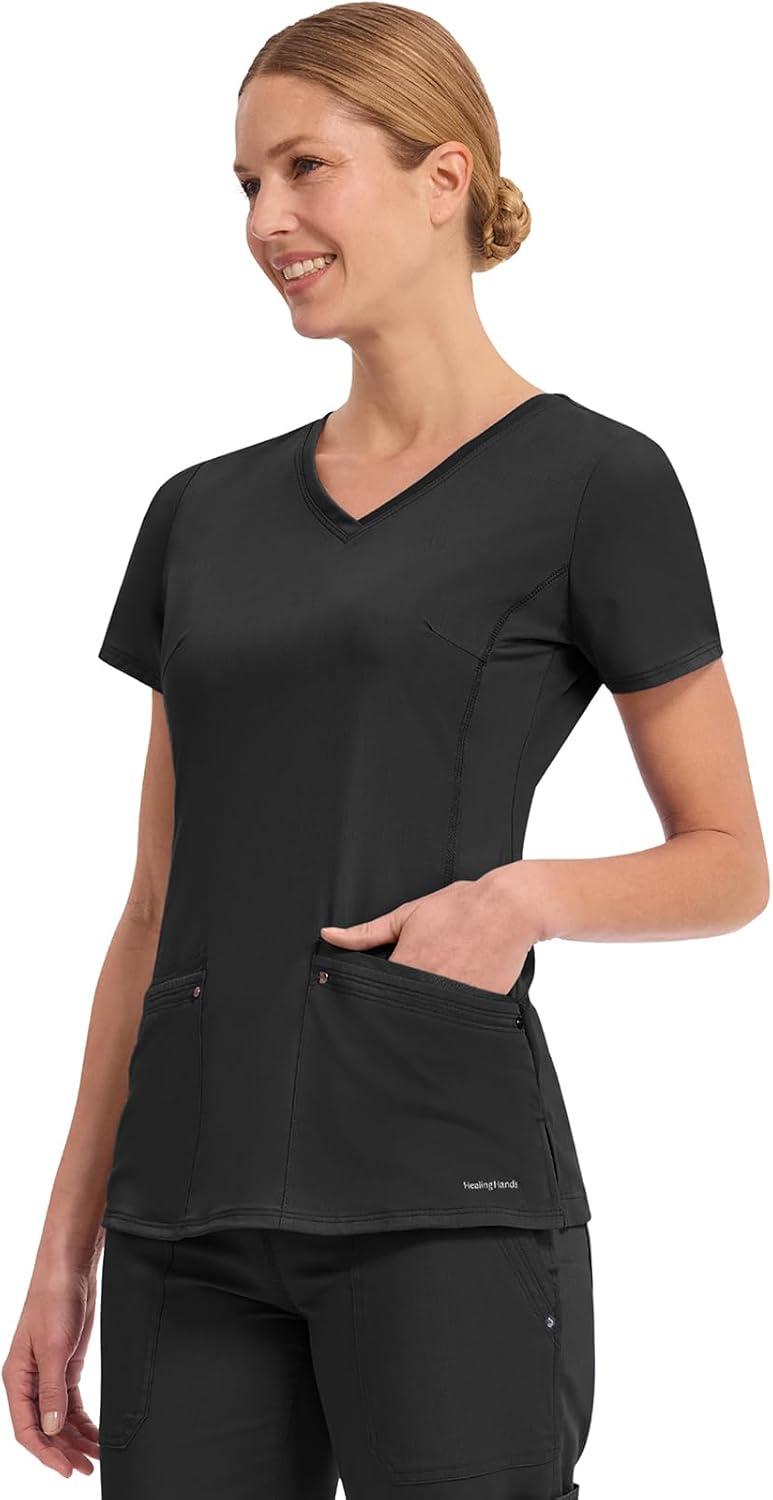 Healing Hands Women’s Scrub Top V-Neck with 2 Pockets, 2-Way Stretch, and Yoga Knit Side Panels for Slim Fit- 2245(Black)