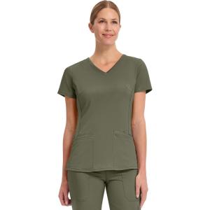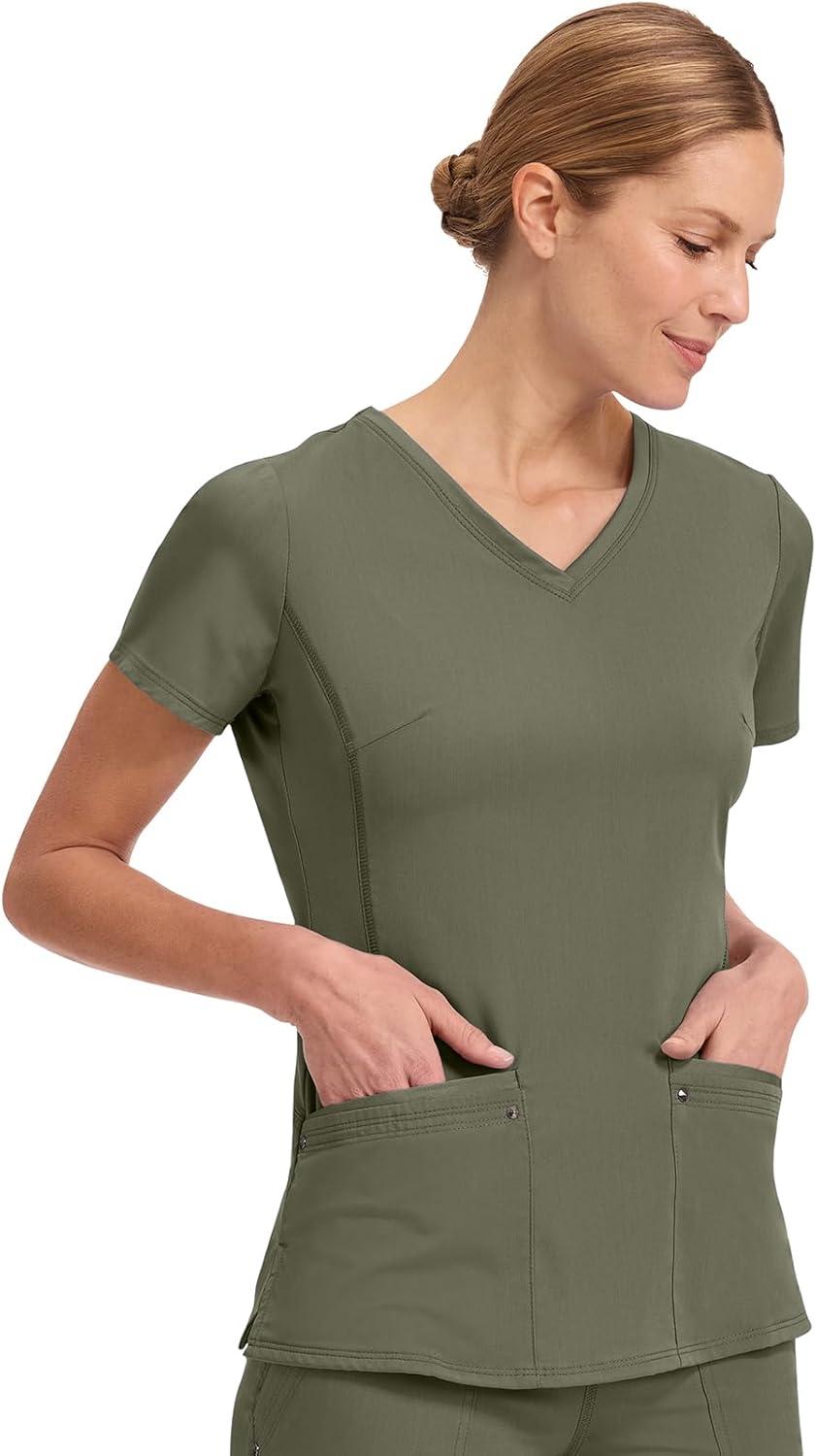 Healing Hands Women’s Scrub Top V-Neck with 2 Pockets, 2-Way Stretch, and Yoga Knit Side Panels for Slim Fit- 2245(Olive)